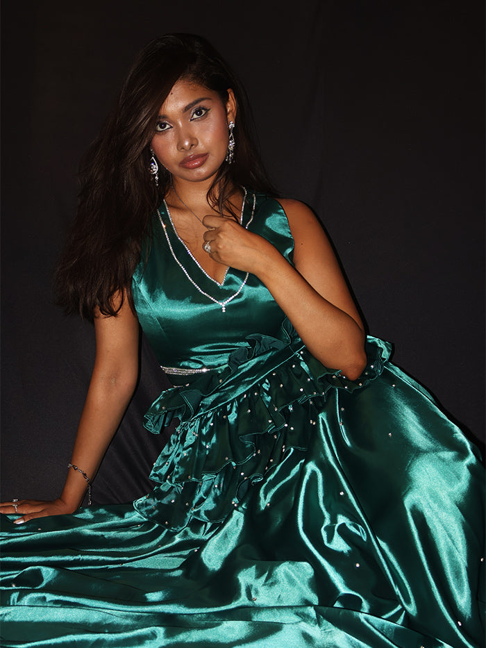 Experience the allure of royalty with our Emerald Elegance Gown. Crafted from luxurious satin fabric and adorned with dazzling stones, this gown features a V neckline embellished with stone accents that mimic an elegant necklace. The gown also boasts a stunning stone belt at the waist, complemented by three ruffles along the waistline for a dramatic, ball-room-worthy effect.