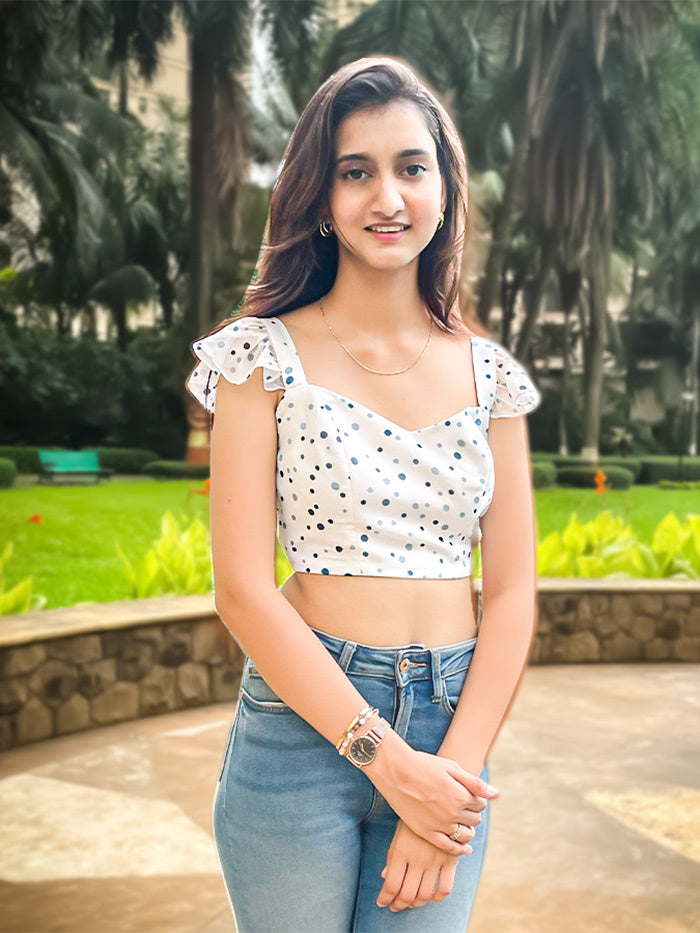 Introducing our Korean Crop Top, a delightful blend of style and charm. Featuring a playful polka dots print, a flattering sweetheart neckline, and frill sleeves, this top exudes feminine allure. Complete with a convenient zip closure, it's both fashionable and functional.