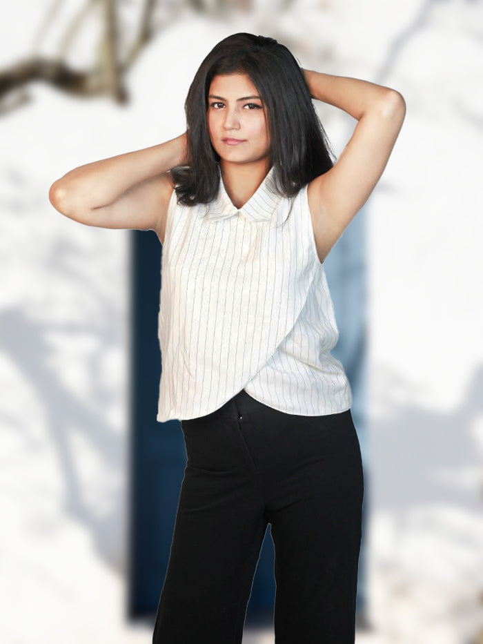 Elevate your sophistication with our White Collar Sleeveless Top, a timeless piece for any wardrobe. Featuring formal lines print and a classic round neck with collar, this sleeveless top is both chic and professional.